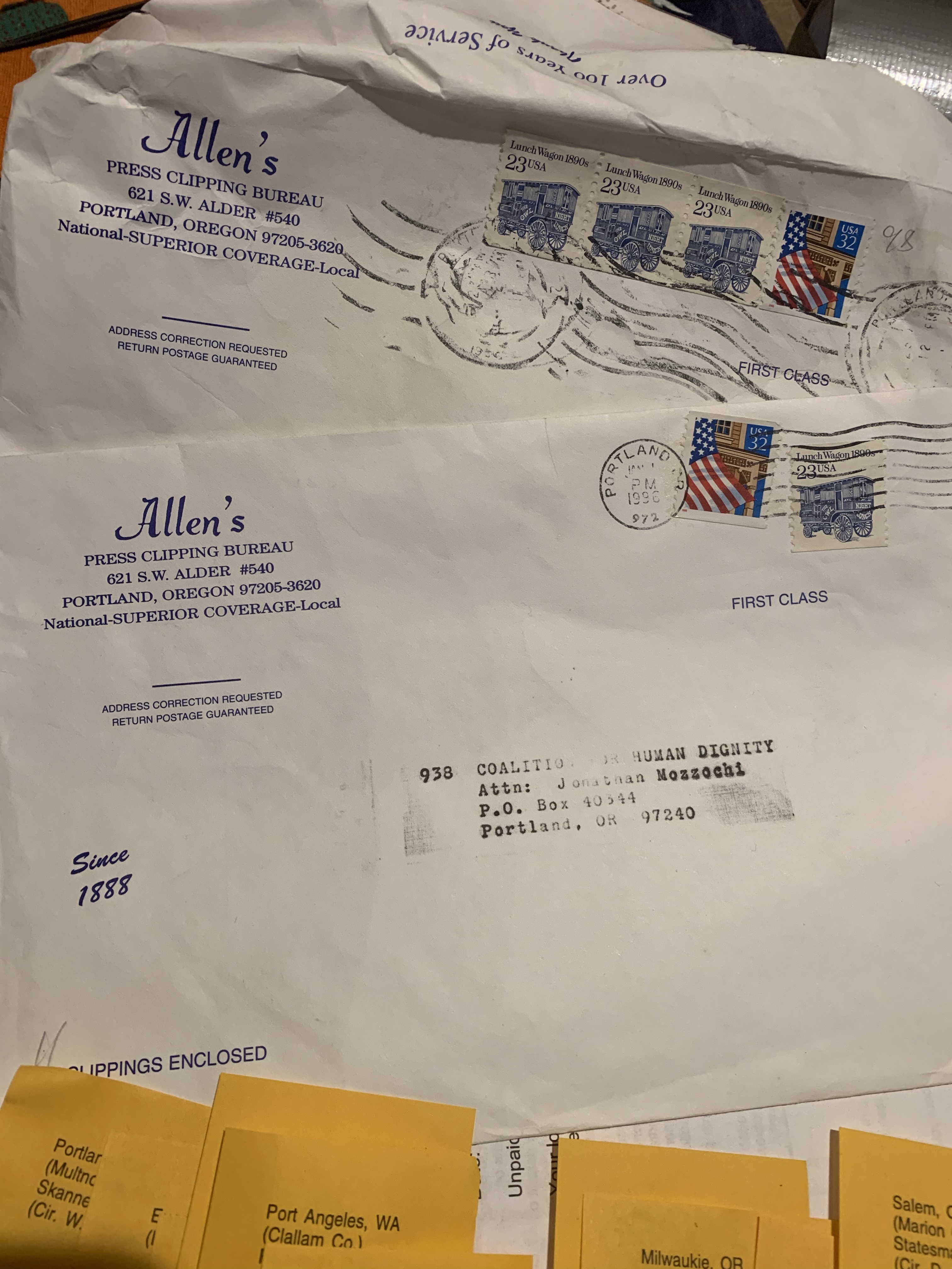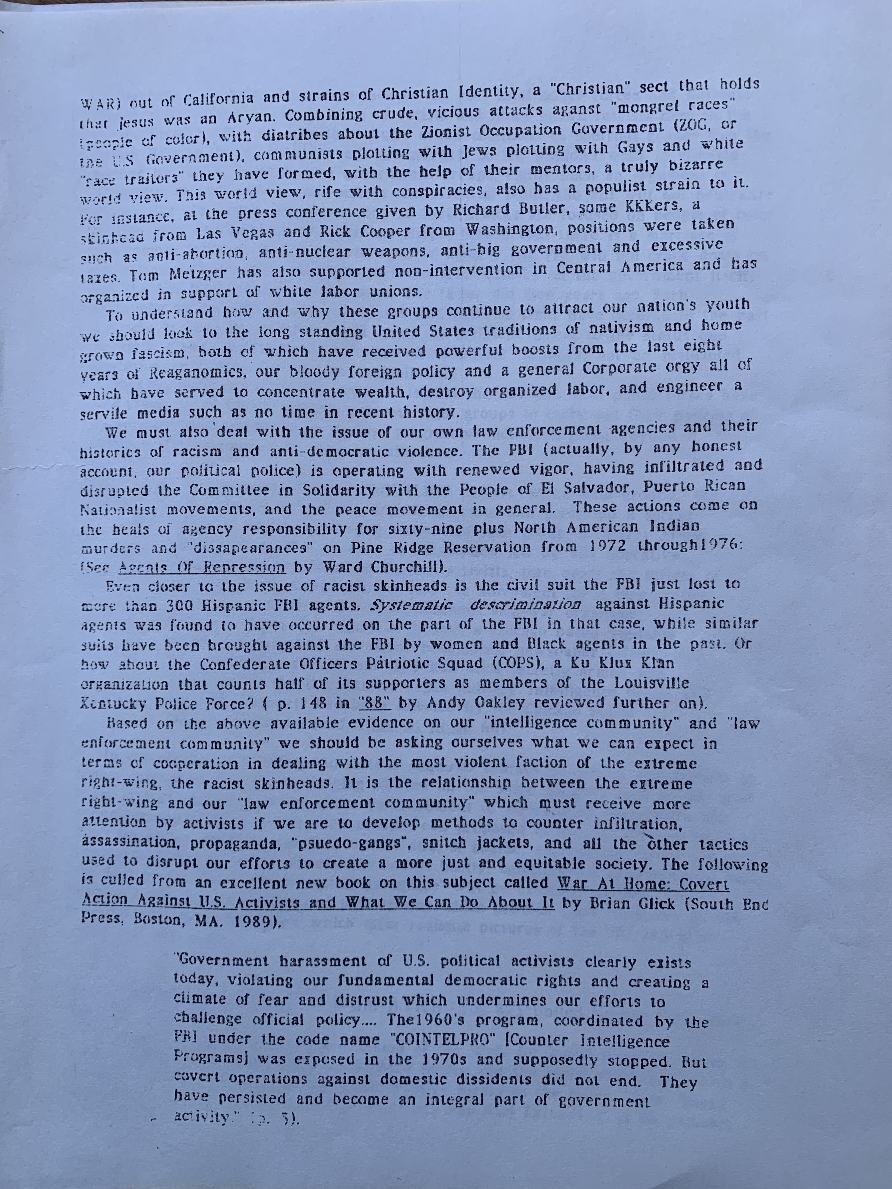 October 1988–correspondence with M. Treloar on skinheads, NAP. He’s moving to Portland in December. Also Fred Goff at the Data Center, Russ Bellant of Political Research Associates, and Searchlight Magazine issues. I’m working part-time at KBOO.