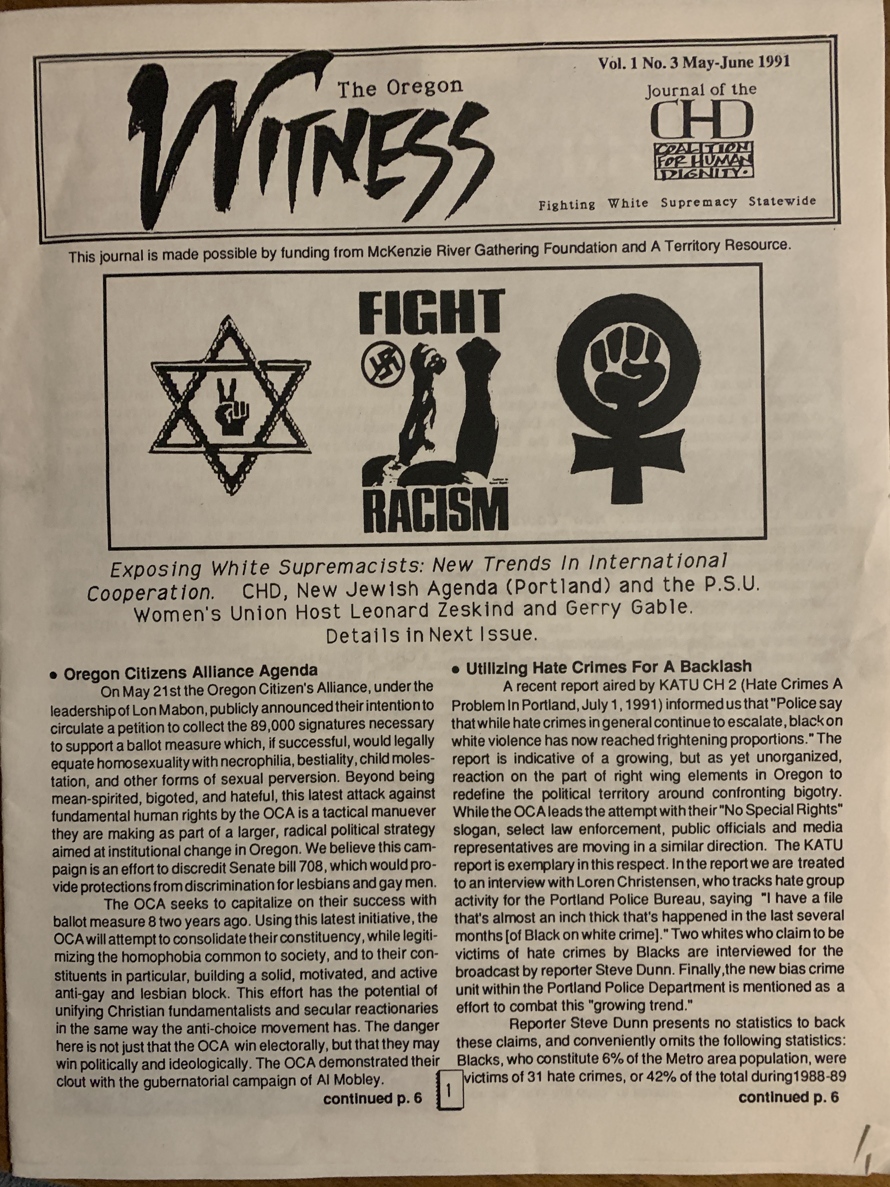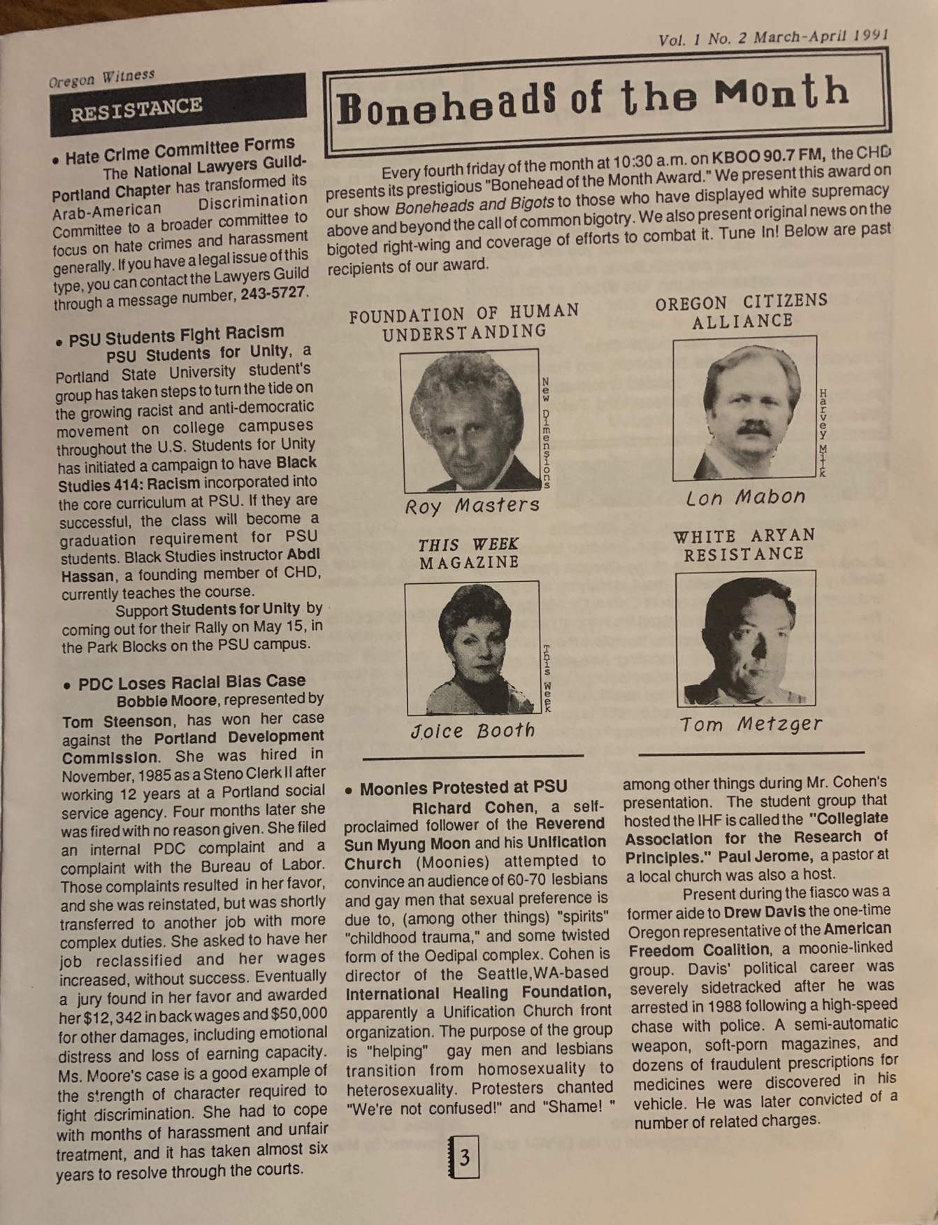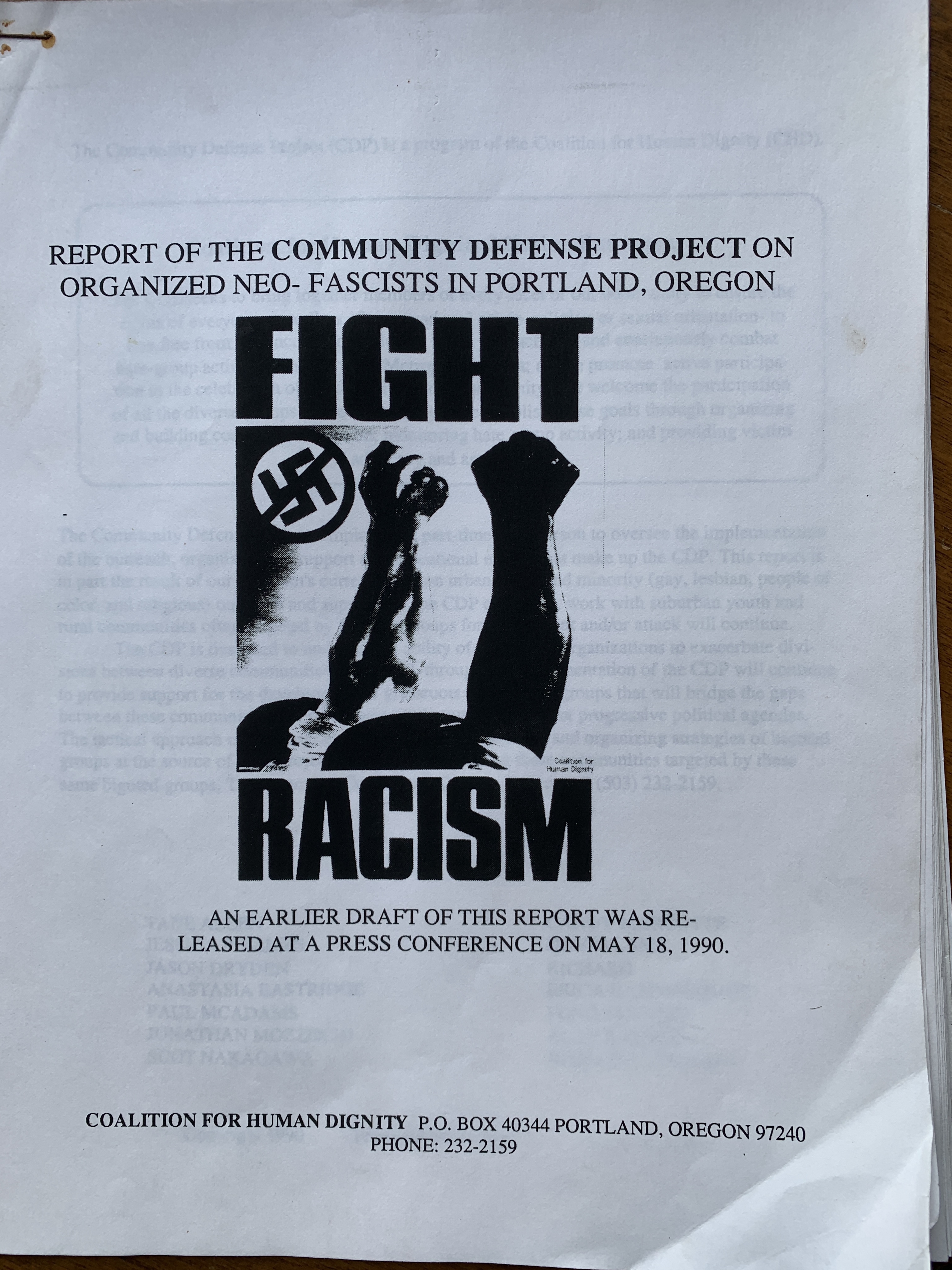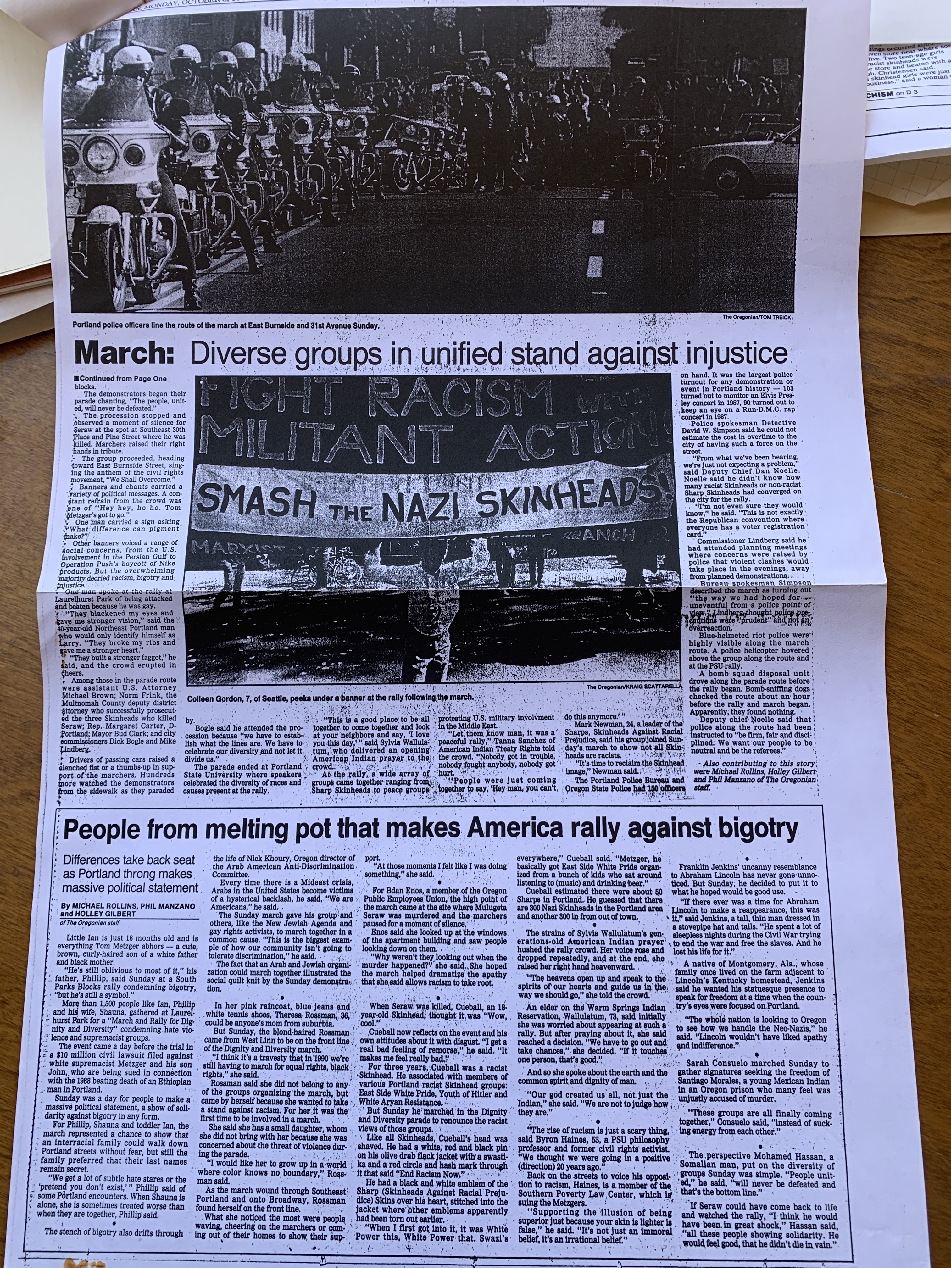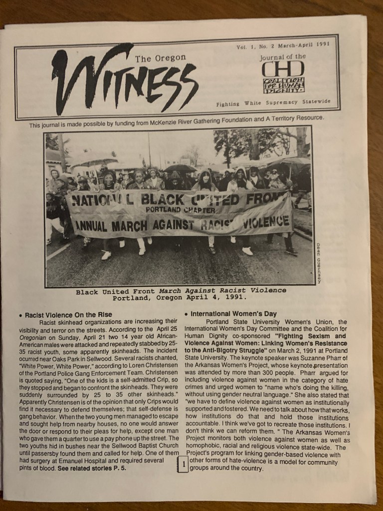 August 1989–I write “Fascist Violence: Establishment Program and Response” for The Portland Free Press, a critique of weak efforts by authorities to understand, document and confront the far-right. Examples include no subpoena power for the Metropolitan Human Rights Commission and very limited funding.