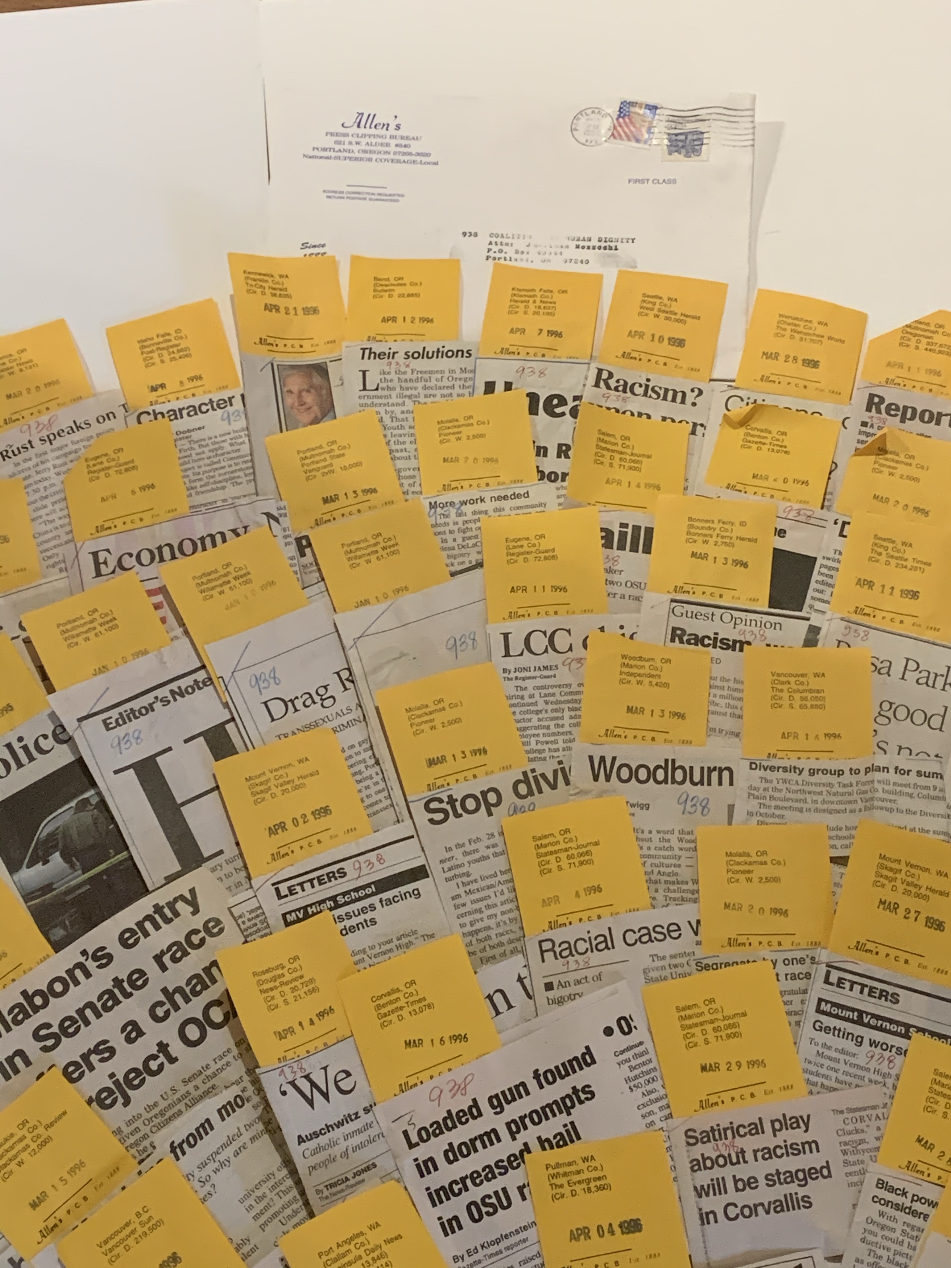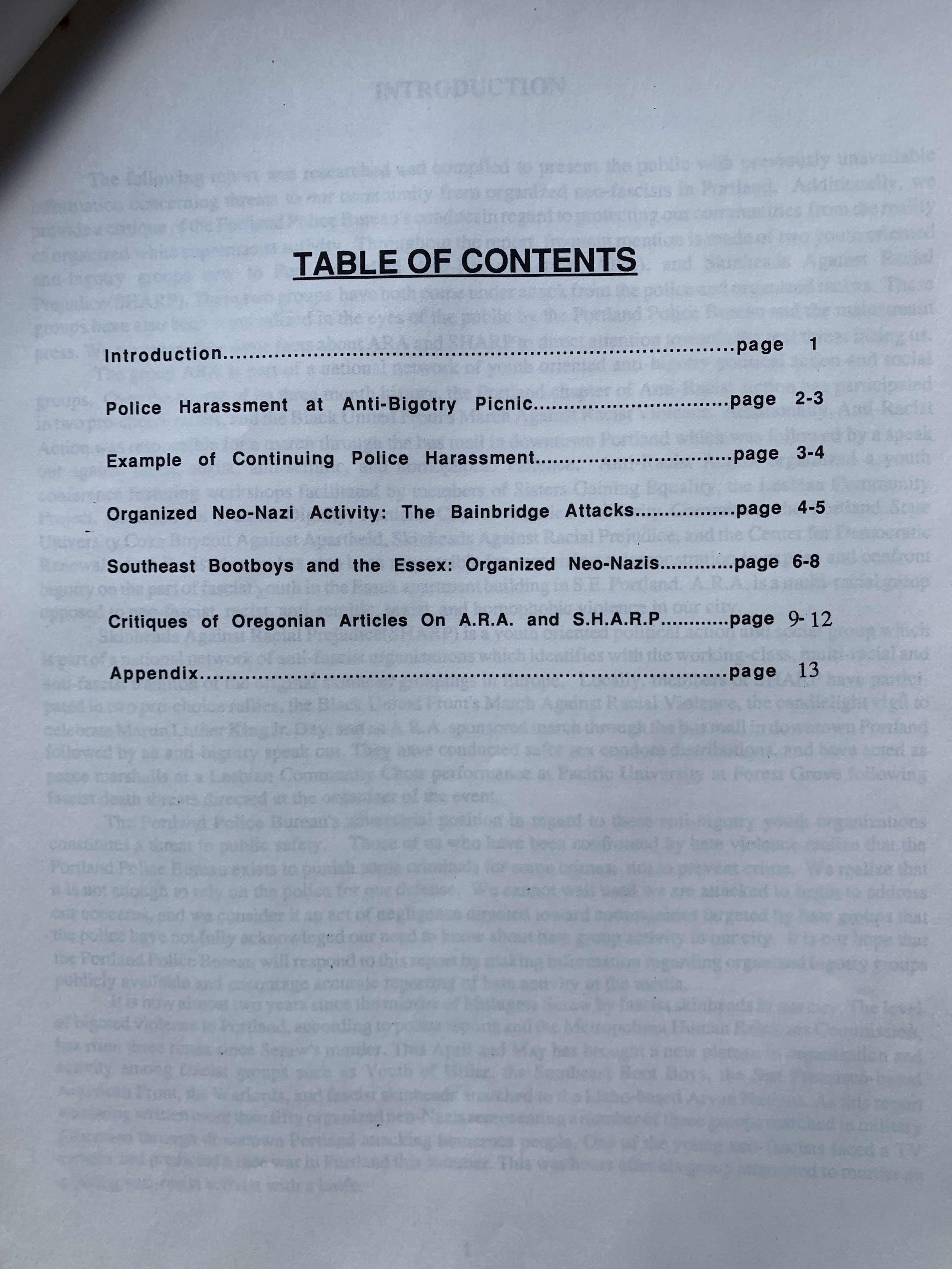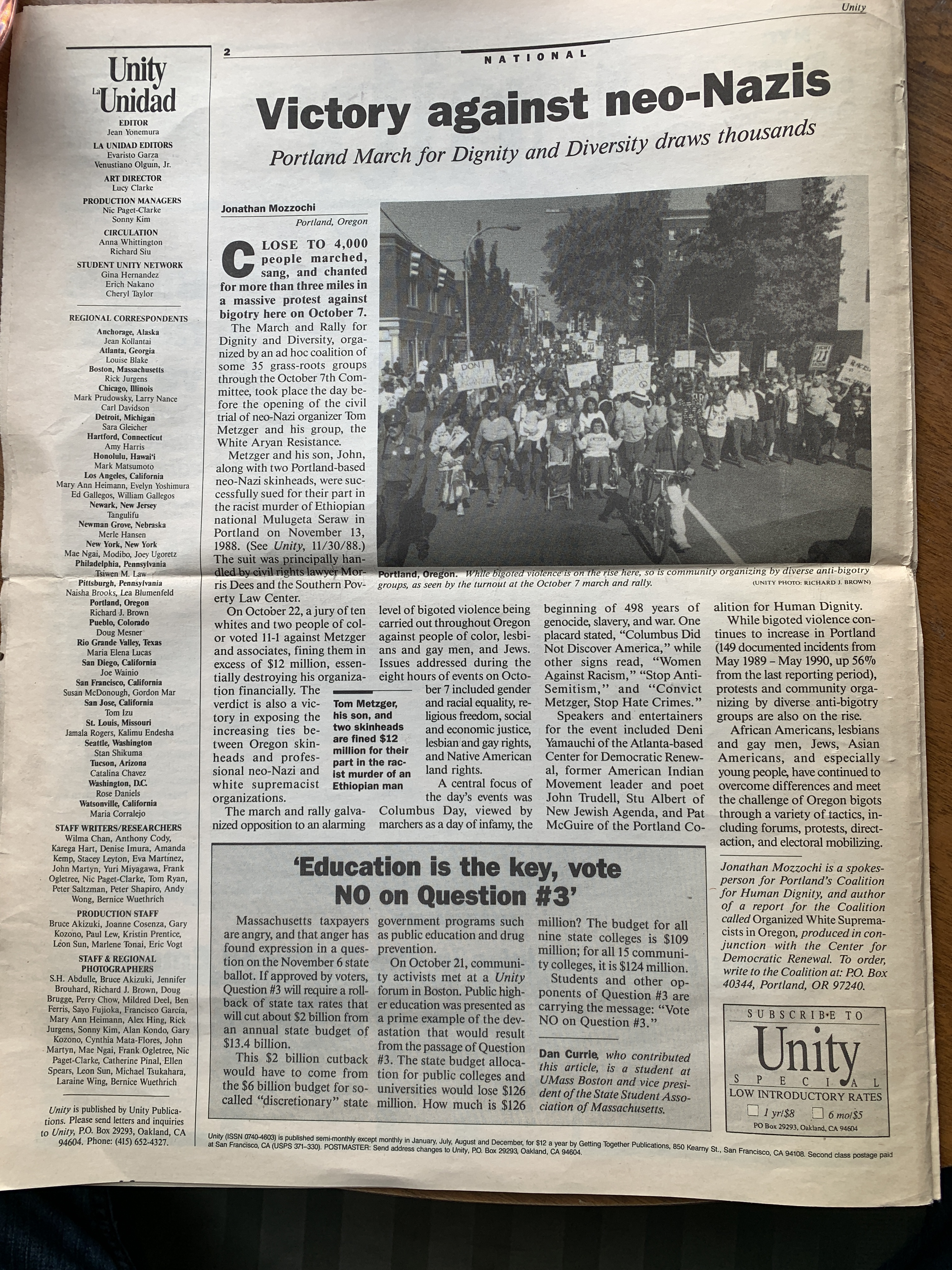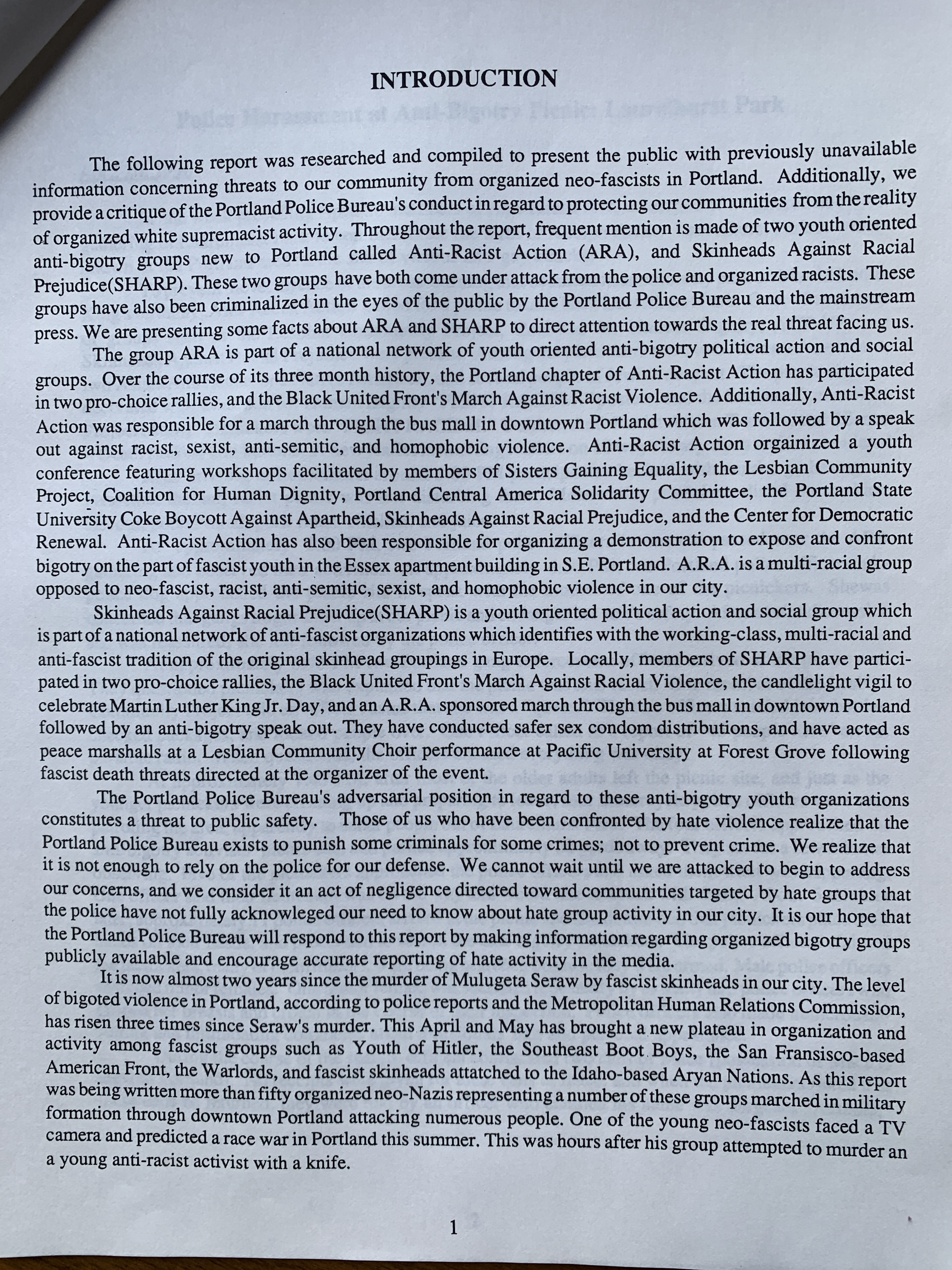 August 1989–I write “Fascist Violence: Establishment Program and Response” for The Portland Free Press, a critique of weak efforts by authorities to understand, document and confront the far-right. Examples include no subpoena power for the Metropolitan Human Rights Commission and very limited funding.