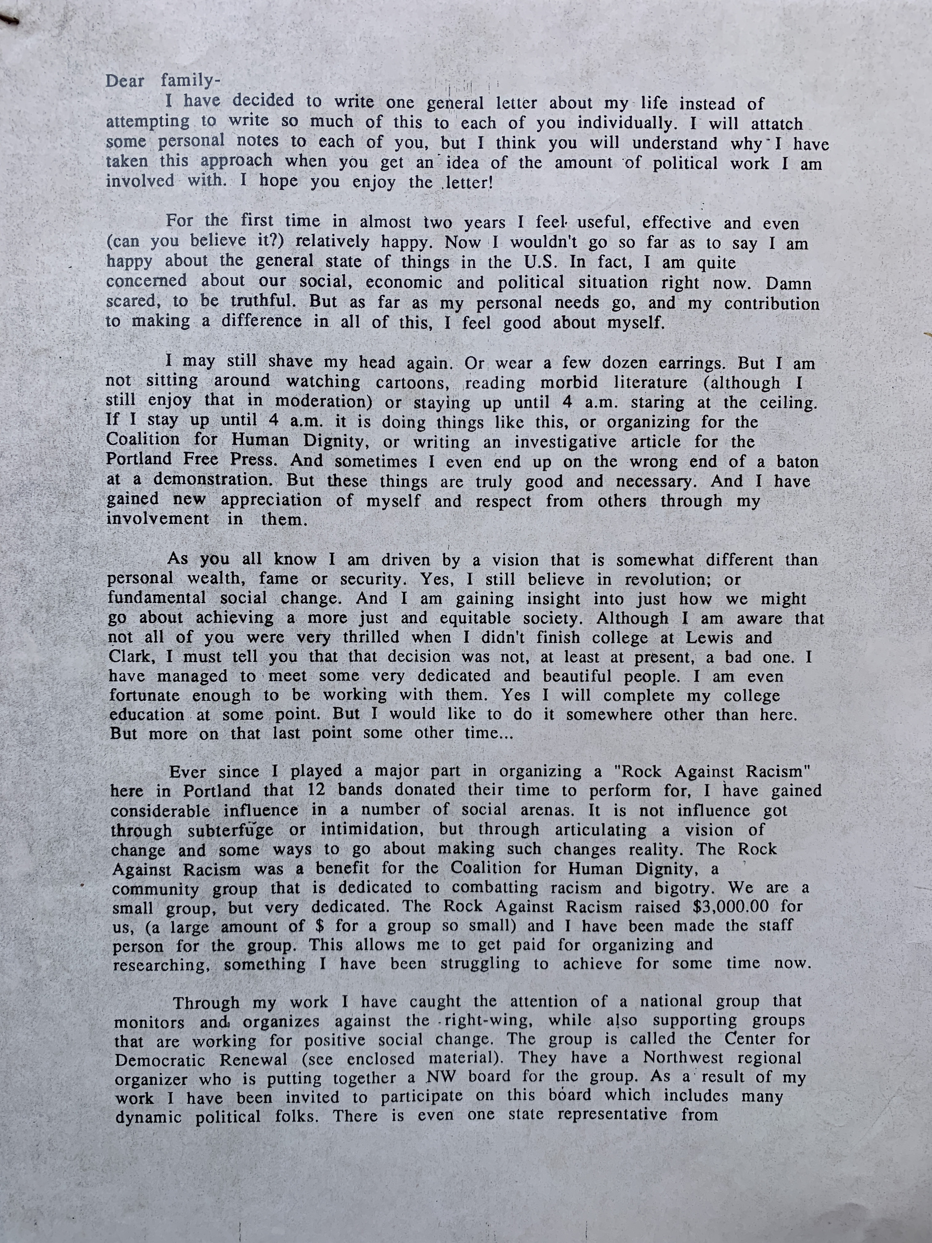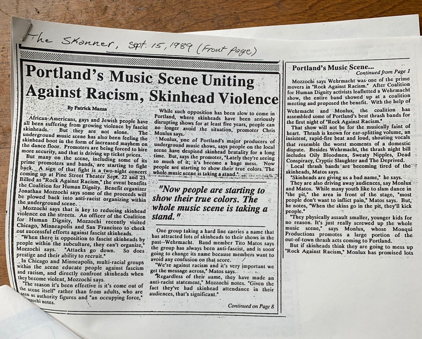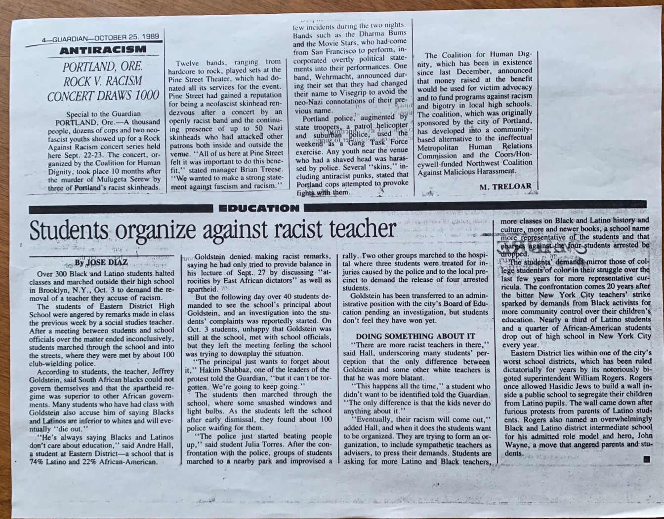 October 25, 1989–M Treloar’s “Rock Against Racism” article in the Guardian. “The coalition, which was originally sponsored by the city of Portland, has developed into a community-based alternative to the ineffectual Metropolitan Human Relations Commission and the Coors/Honeywell-funded Northwest Coalition Against Malicious Harrassment.”