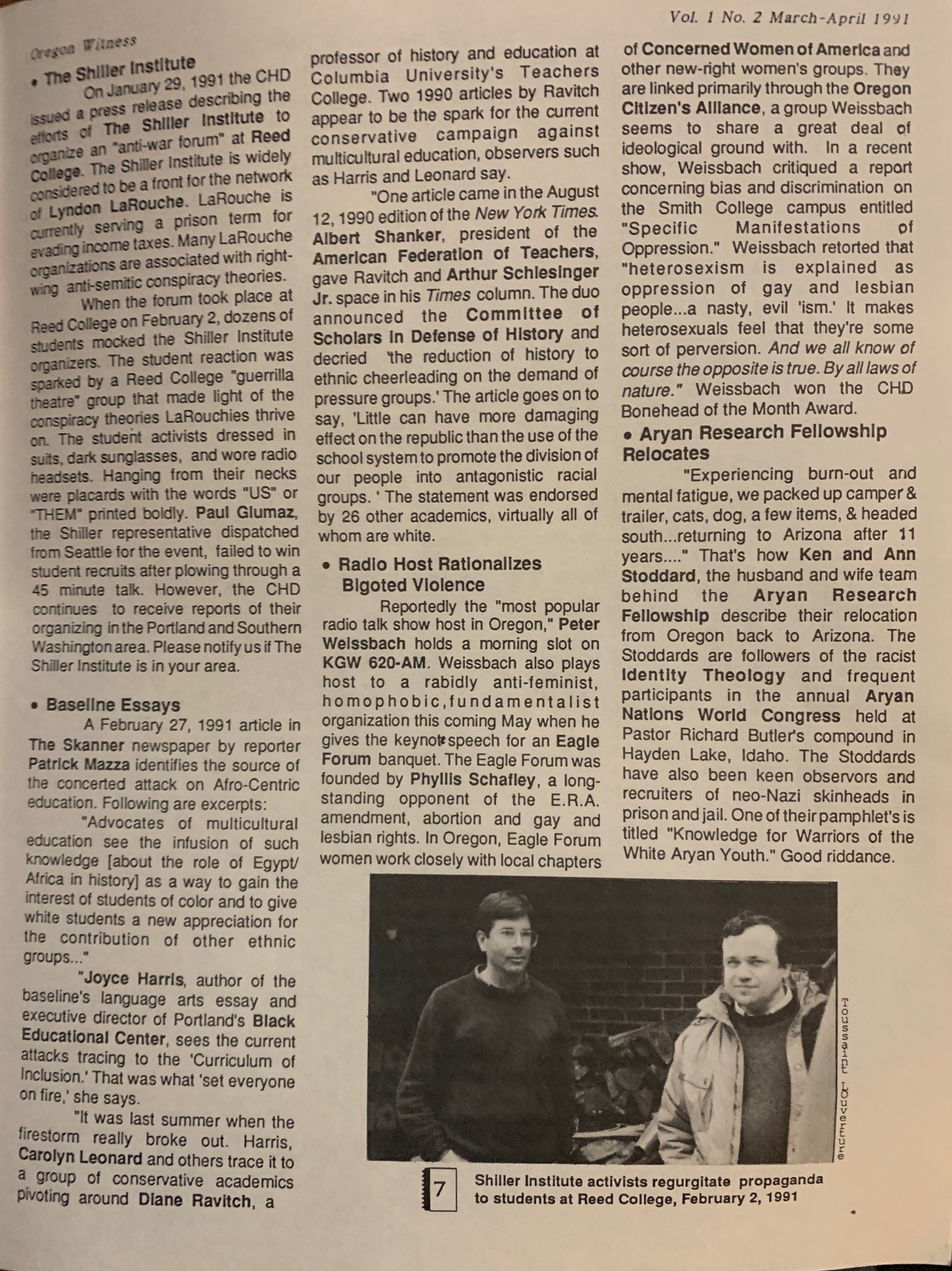 1990–Lenny Zeskind from the Center for Democratic Renewal and Gerry Gable from Searchlight Magazine in England are hosted at an event at Portland State University.