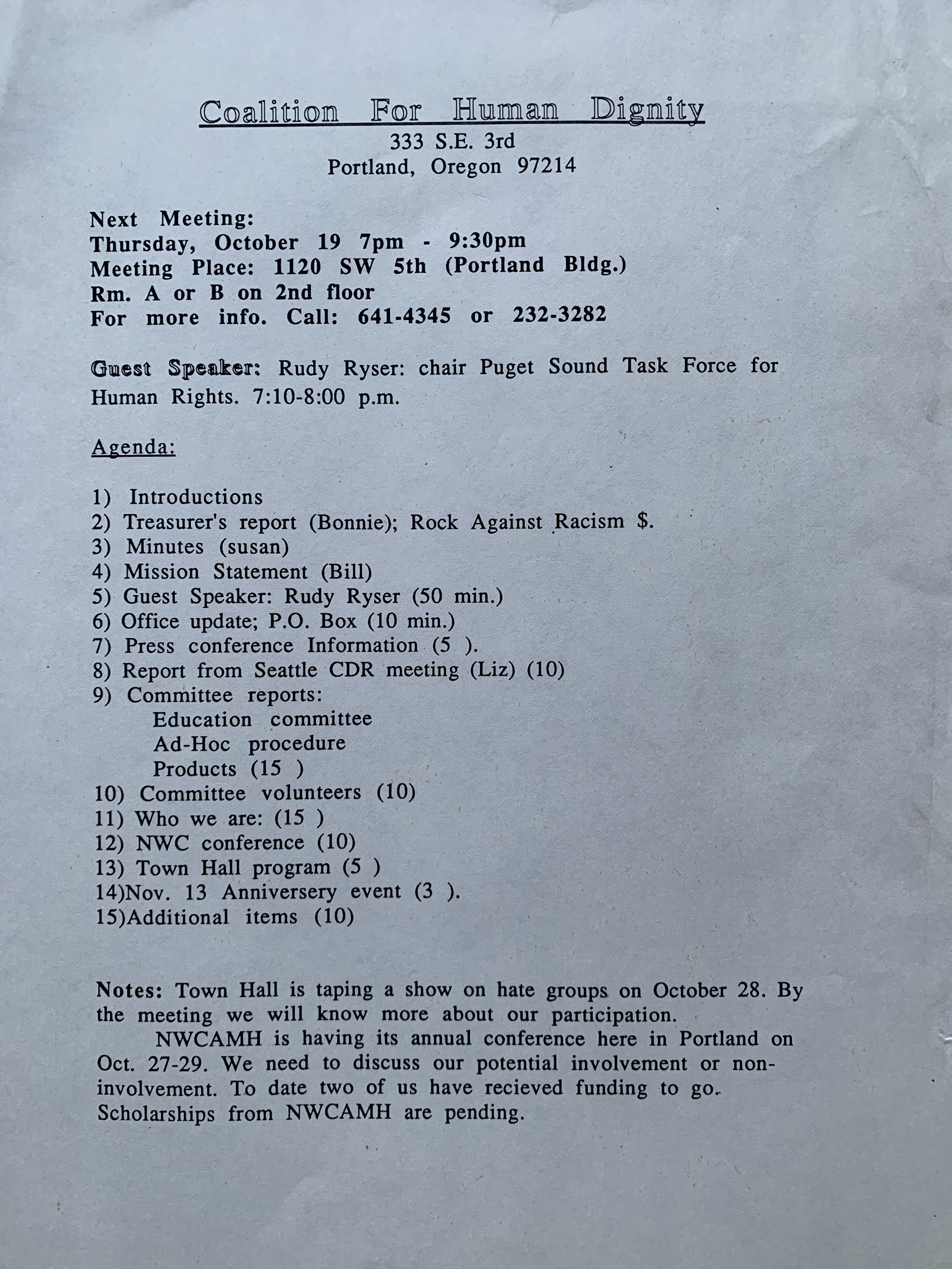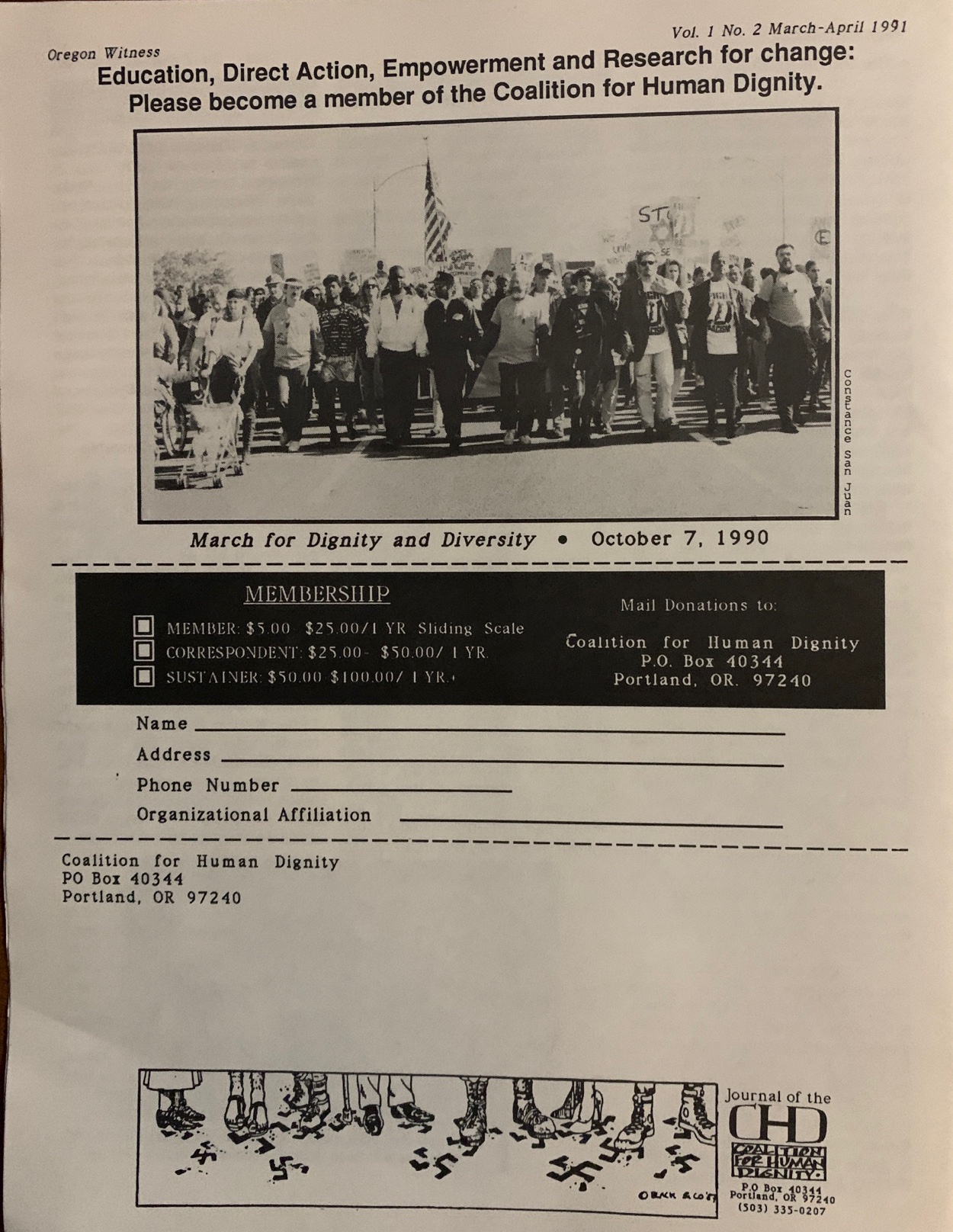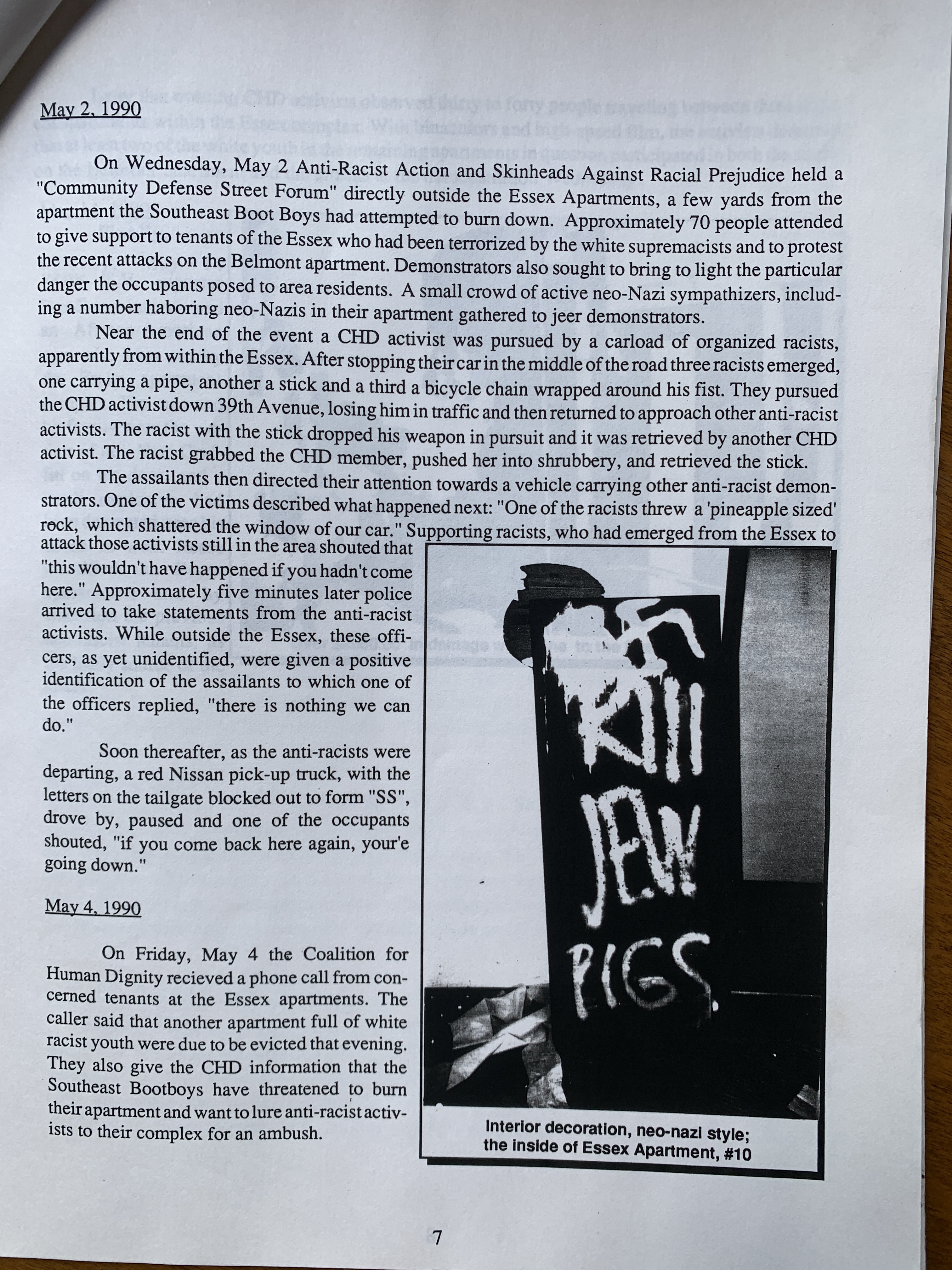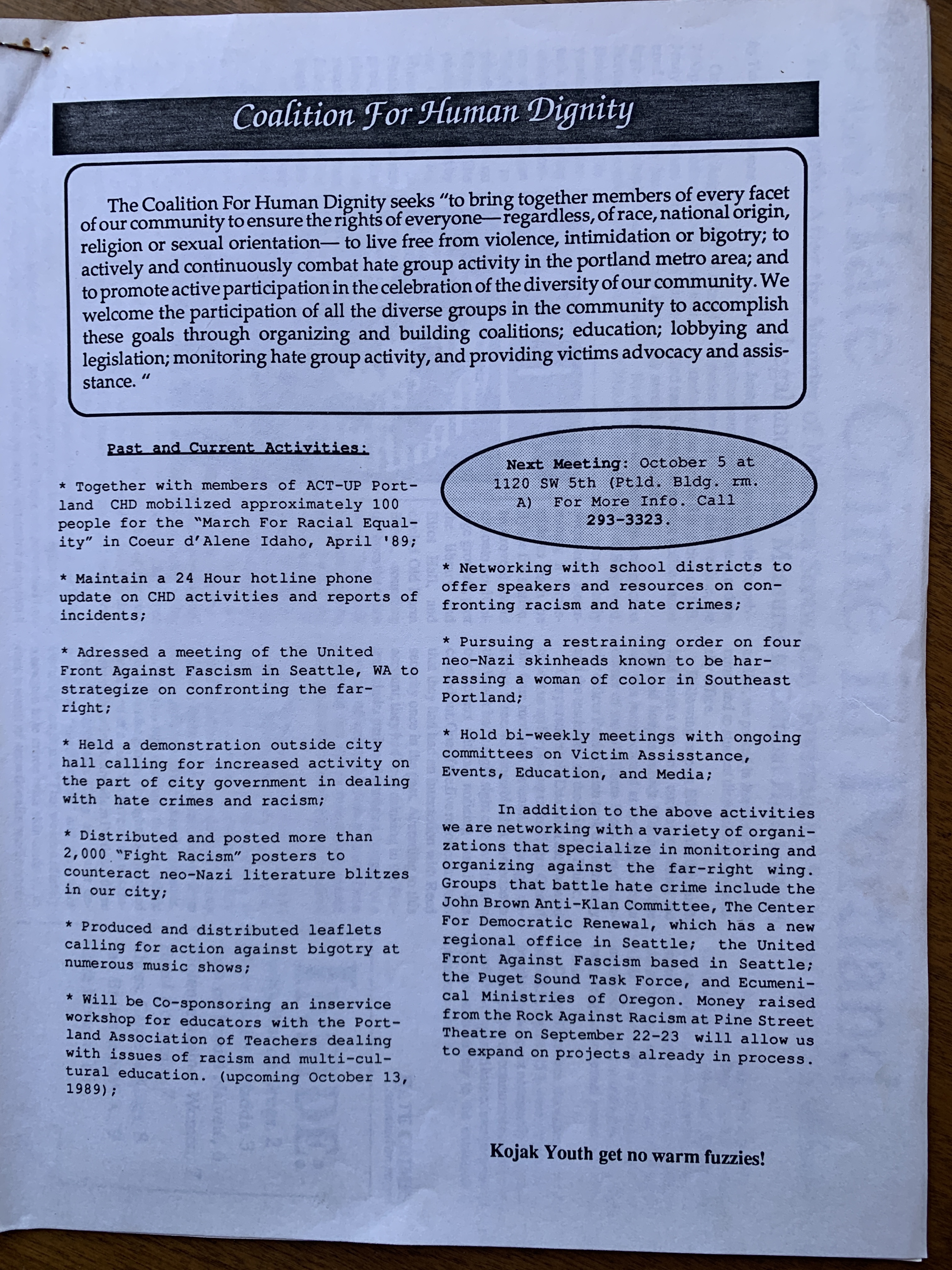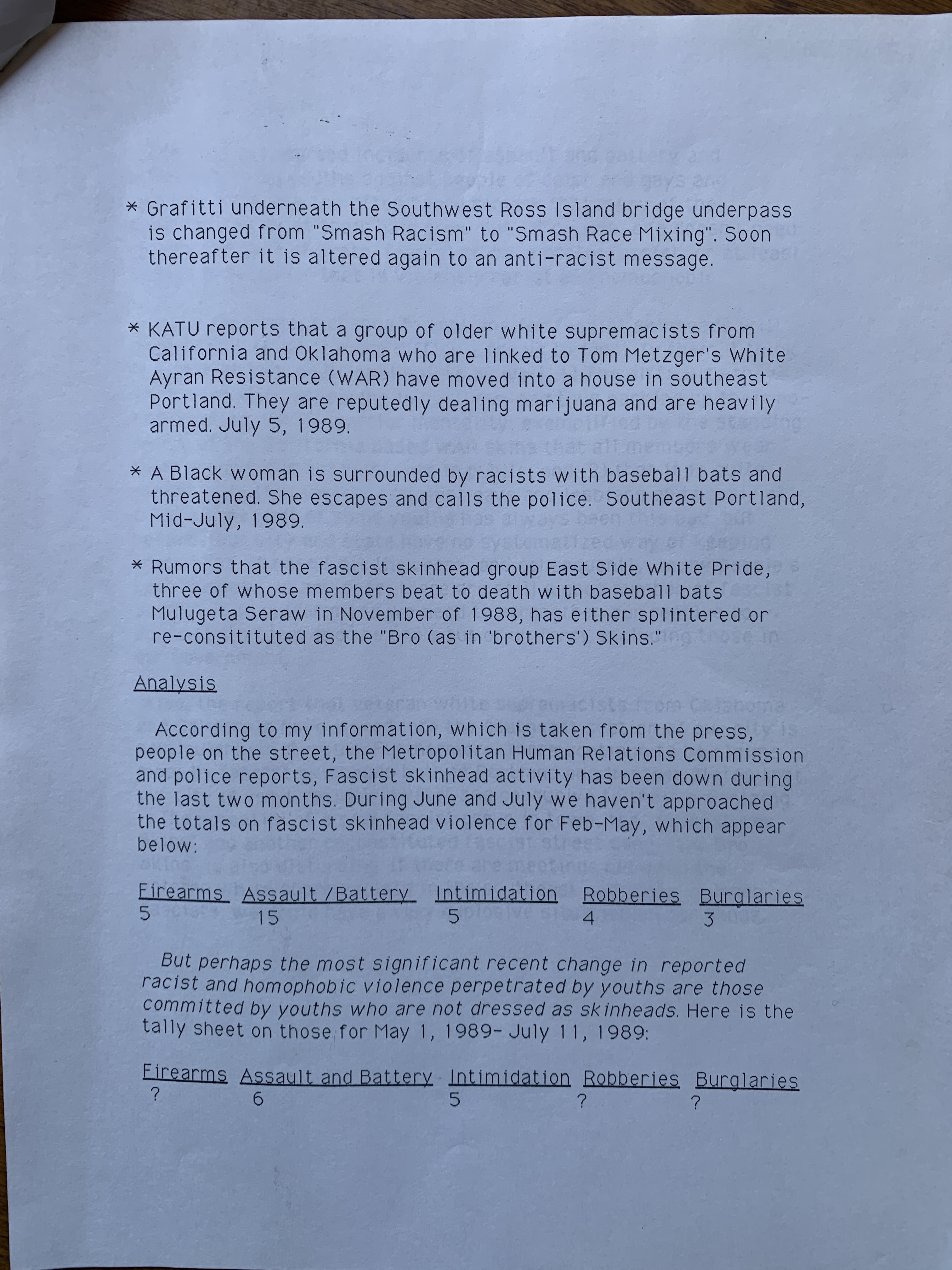 July, 1989–I write “Fascist Skinheads: An Update and Analysis” for CHD. This was an early effort to get a handle on both the number of hate crimes and types of groups active in the Portland Metro area. Statistics on bias violence and intimidation were a hit-or-miss proposition; where there was even a law to collect such data there was insufficient awareness on the part of cops to collect it. As usual, community groups had to do it for ourselves. A similar project was carried out by the Lesbian Community Project, called the Homophobic Documentation Line, which took reports of homophobic violence from the community.
