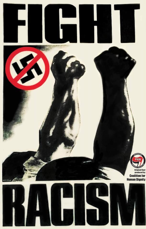 This poster and t-shirt created by comrades in the Coalition for Human Dignity in Summer 1989 in Portland, Oregon is being produced and distributed there again, for obvious reasons. The original design was cribbed from the great anti-fascist artist John Heartfield. The translation from German: “Whether black or white – united in battle. We only know one race. We all know only one enemy – the exploiting class.” Please forgive us for compressing those outstretched arms and fists! All solidarity to comrades in Little Beirut!