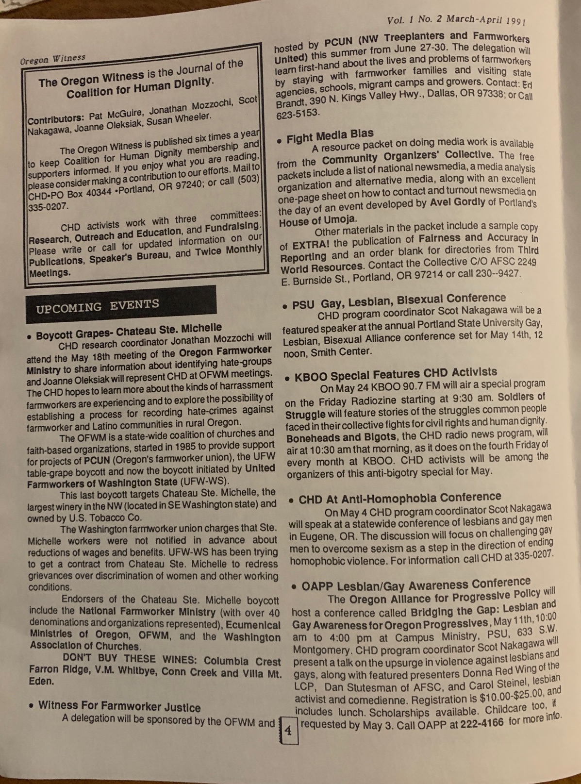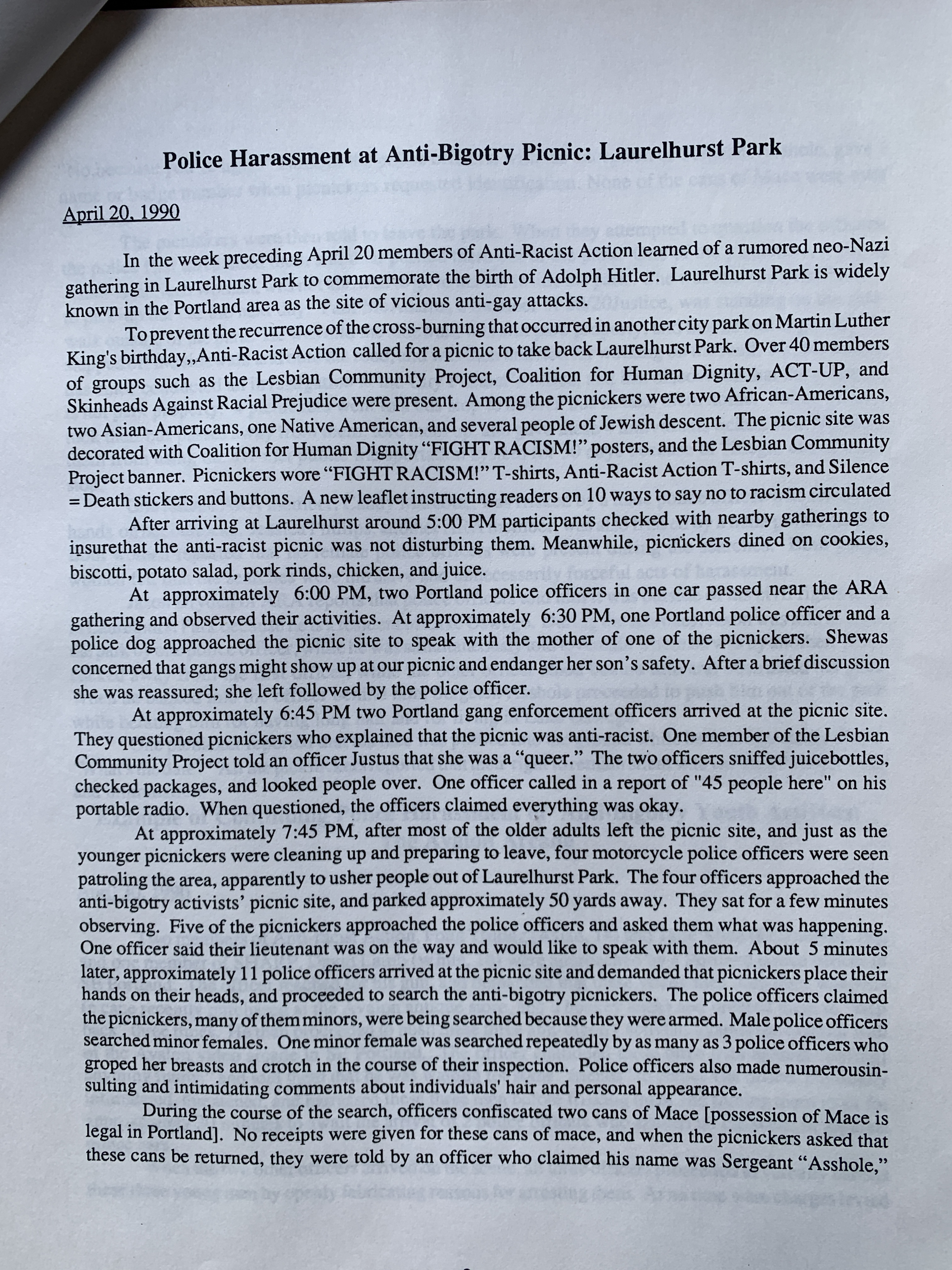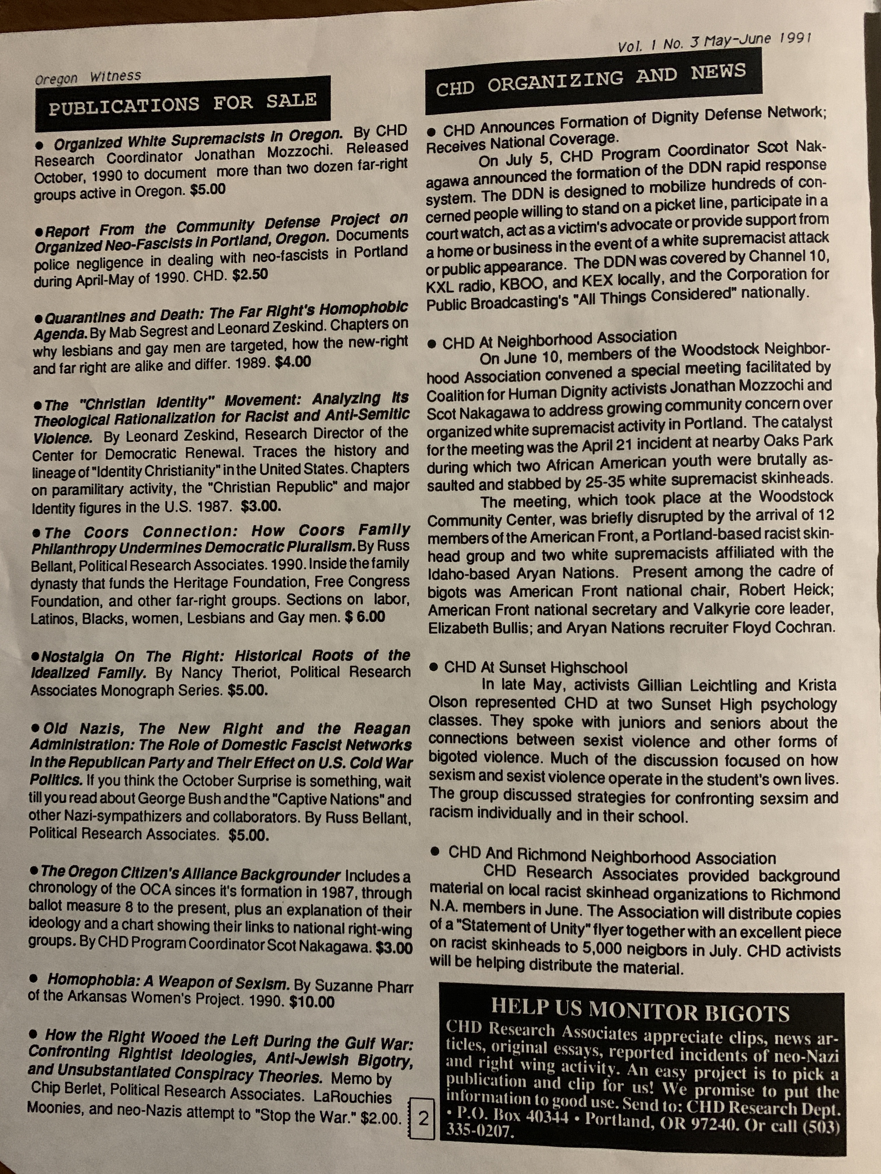 May 18, 1990–CHD, the Lesbian Community Project and SHARP represented by Donna Redwing, Scott Nakagawa, and Dave Lamb, respectively, hold a press conference denouncing police harrassment of anti-racists. CHD releases “Report on the Community Defence Project on Organized neo-fascists in Portland, Oregon.” In the early days CHD would sometimes use the term “fascism” as a general descriptor. The report was a collective effort and fourteen contributors are listed. It’s an important documentation of the rancid role of the PPB in protecting boneheads and a great snapshot of CHD beginning to do action-oriented research.