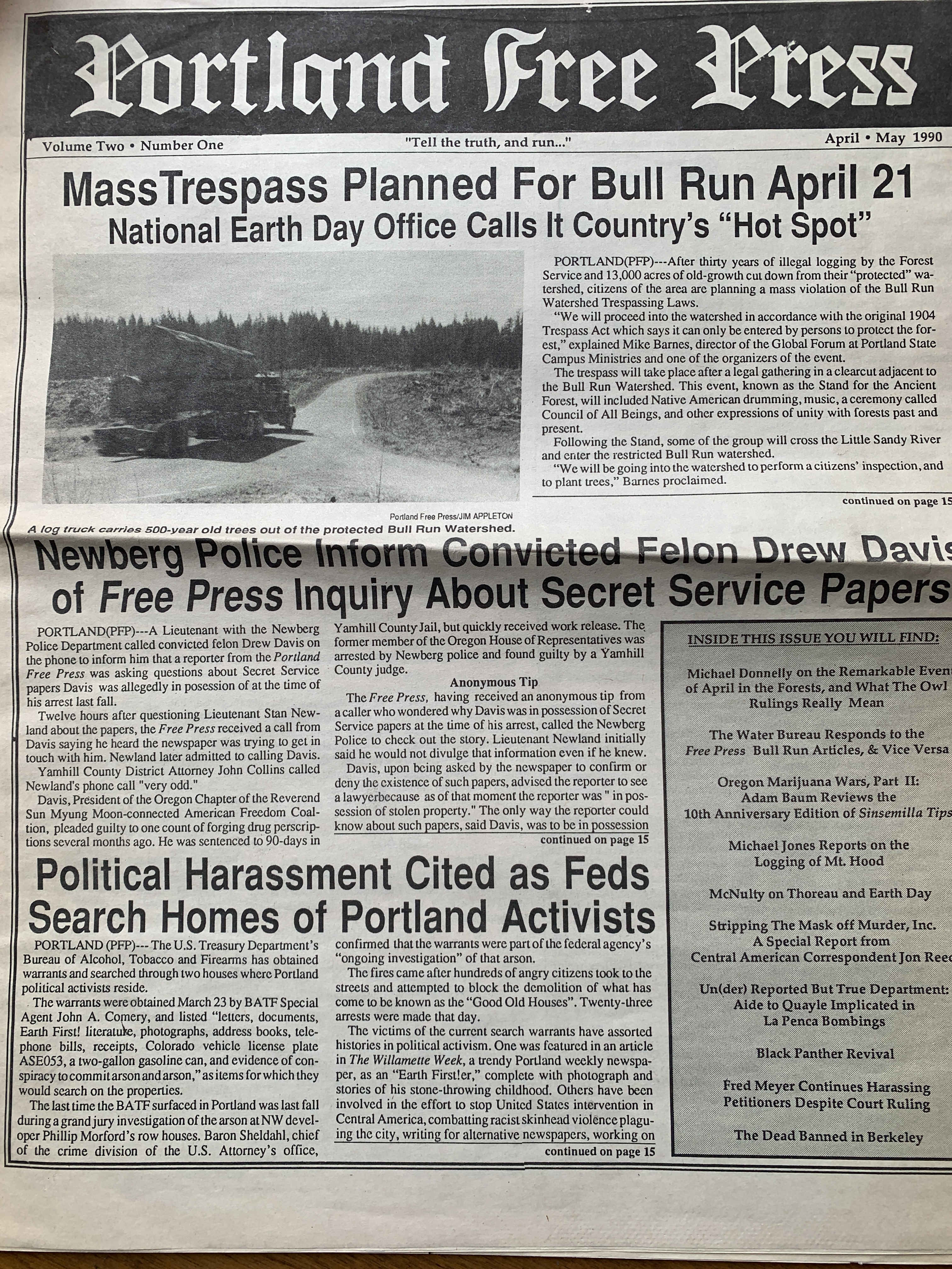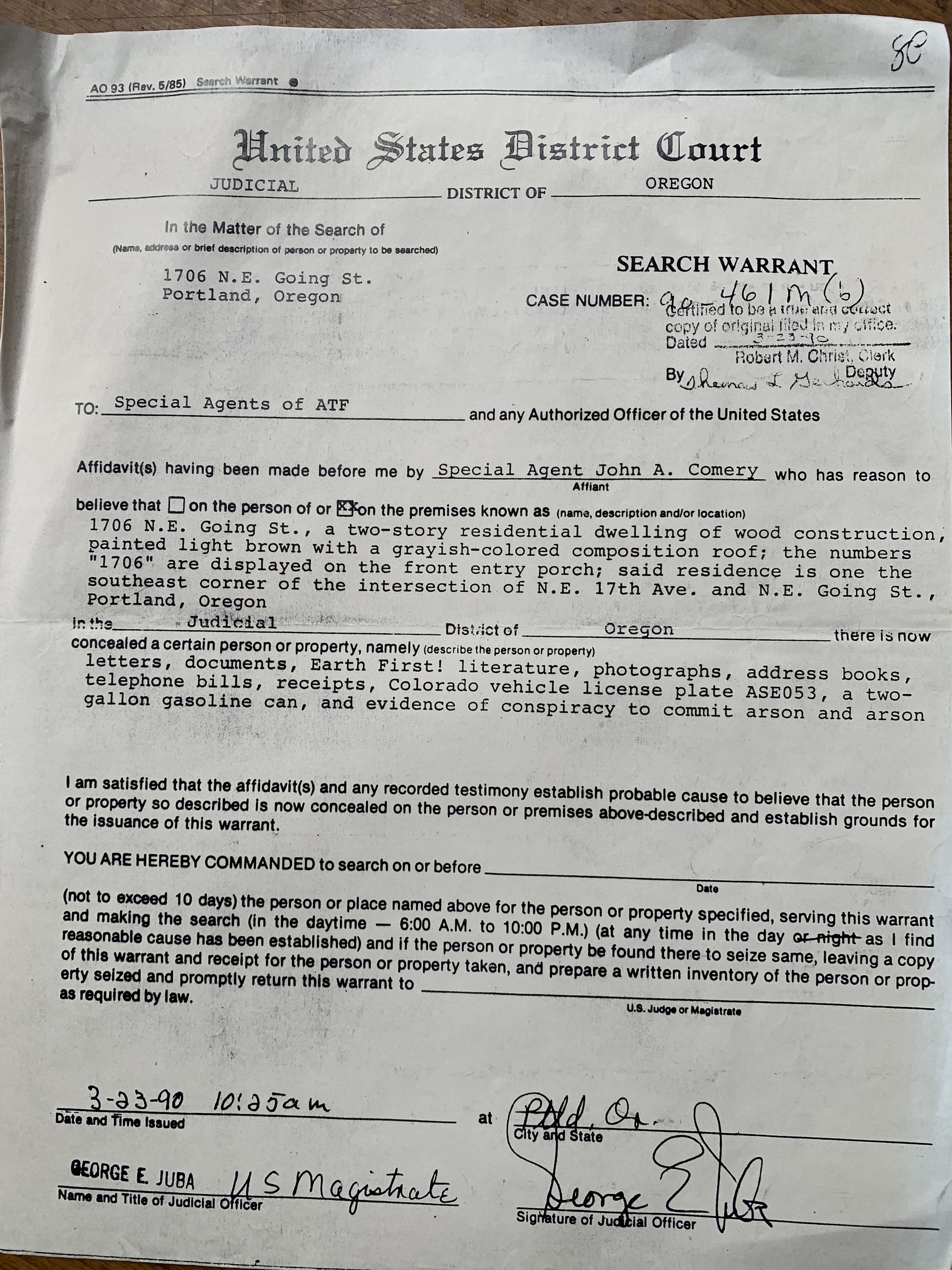 March 3, 1990–the ATF raid homes of activists (including mine) searching for “evidence to commit arson and arson.” Agent John Comey heads up the investigation. No charges filed. I received an anonymous warning of the raid by phone. Portland Free Press article.