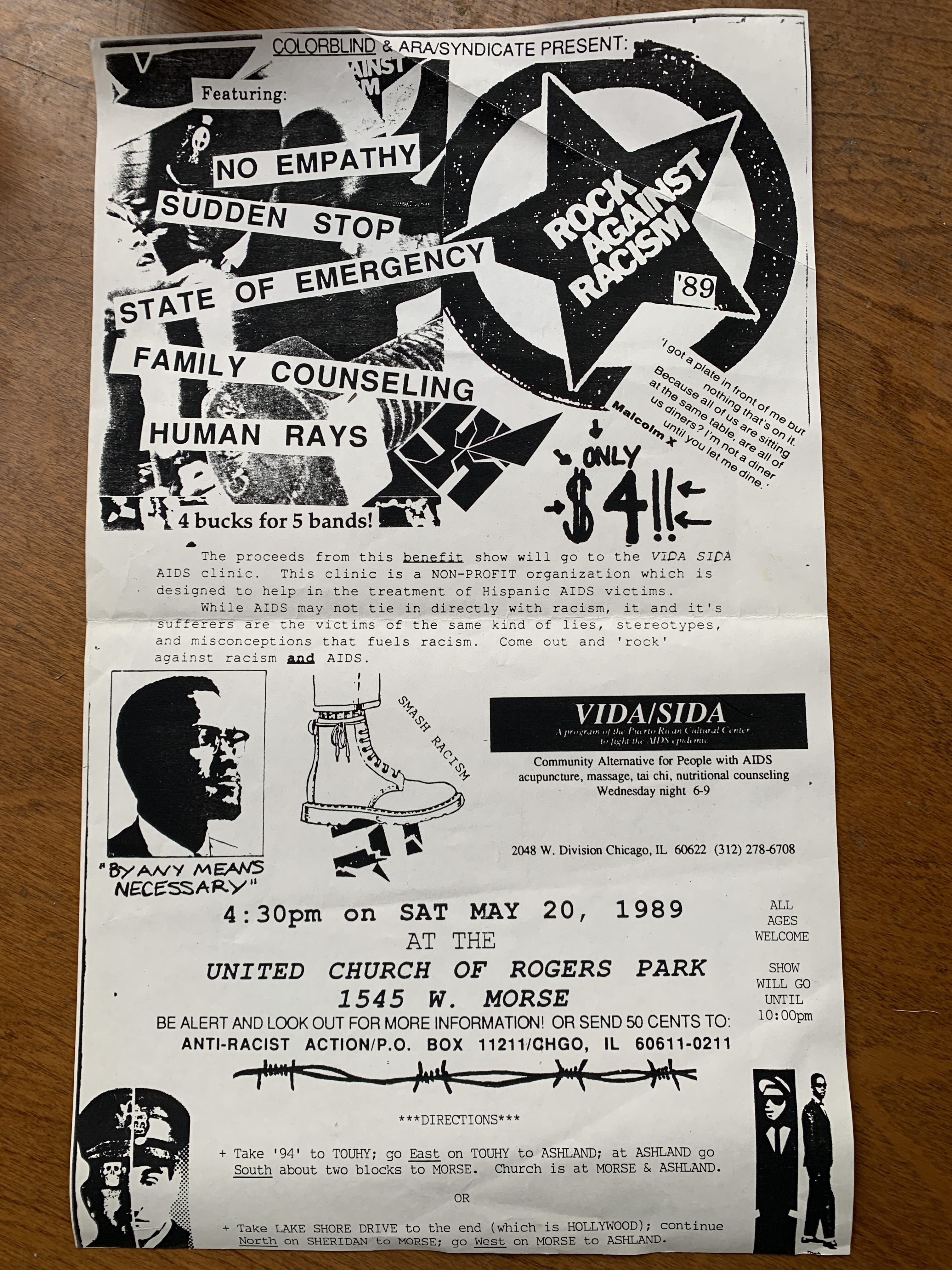 September 22-23, 1989. CHD organizes a Rock Against Racism benefit held at Pine Street Theater. “Fight Racism” posters are going up in neighborhoods. We cribbed from the great anti-fascist artist John Heartfield — Excavating the past so as to reveal the future.