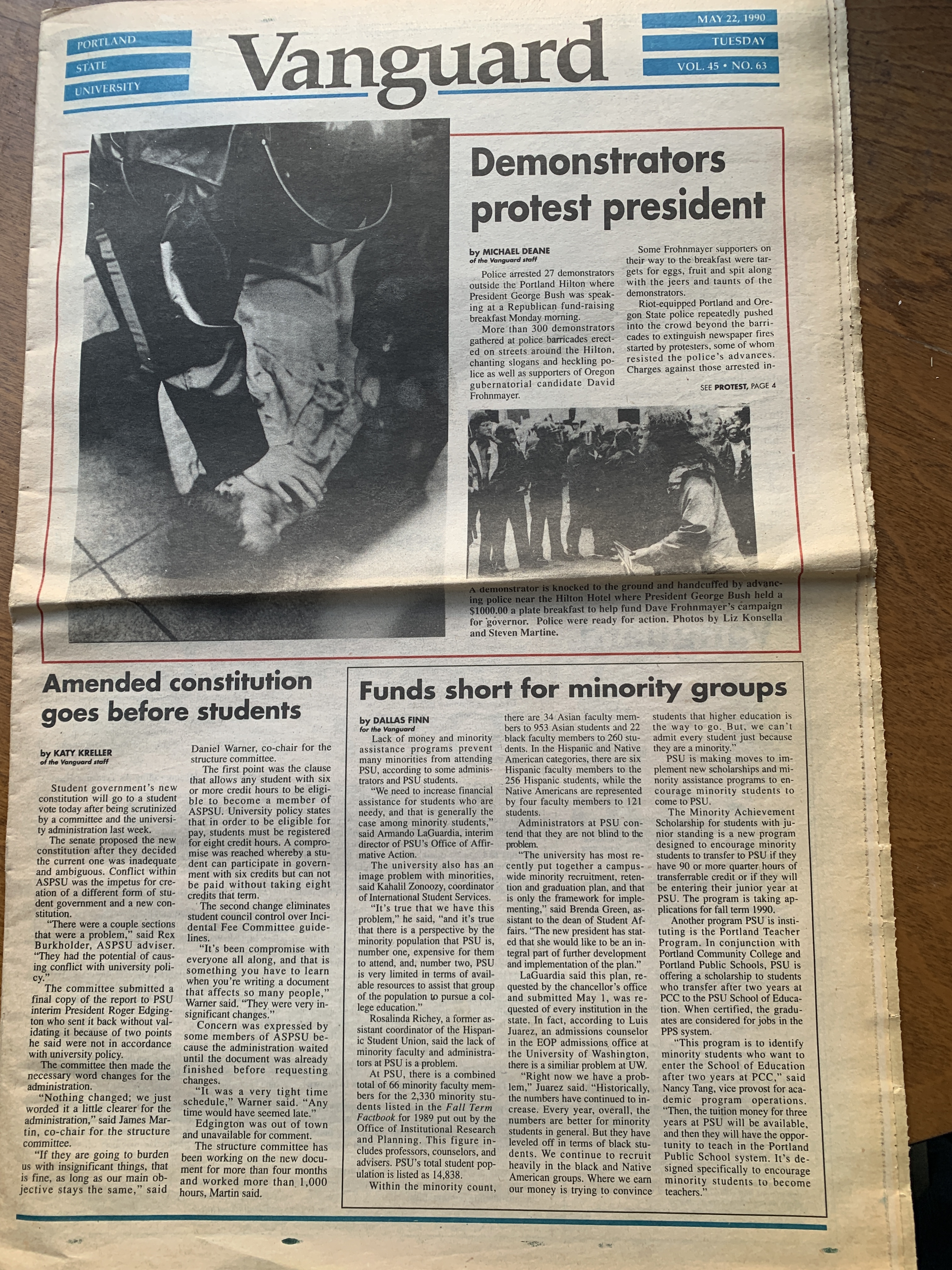 It was the largest protest Quayle had encountered during his first nine months in office, and the only one to disrupt his schedule as protesters blocked his way to the Hilton downtown. Over 20 protesters were arrested and a police van transporting several protesters crashed into a pickup truck on its way to the precinct—this appears to have been an honest error and not a rough ride.” —Willamette Week “Big Trouble in Little Beirut” May 4, 2016.