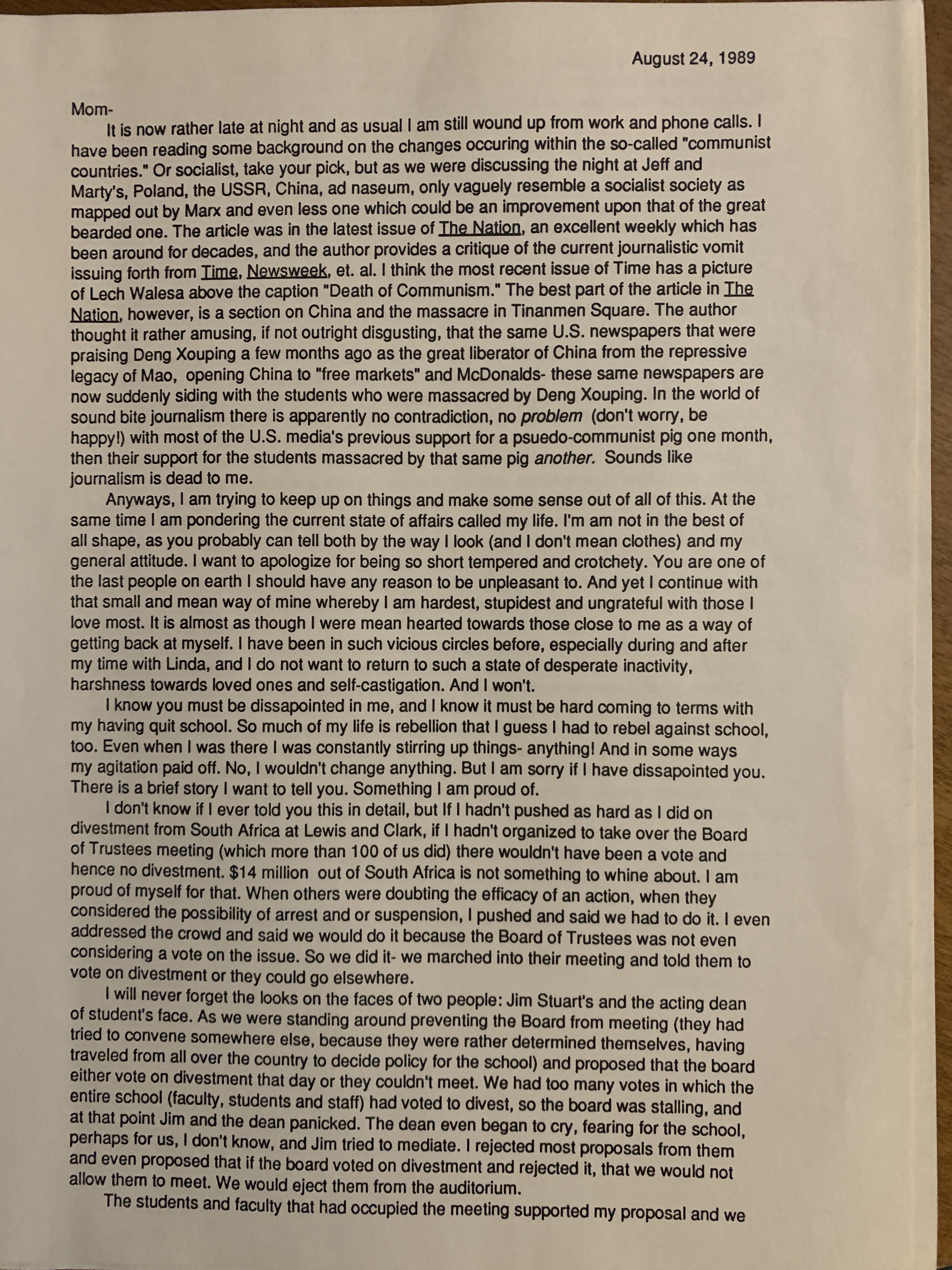 August 24, 1989–Letter to my Mom after I drop out of college.
