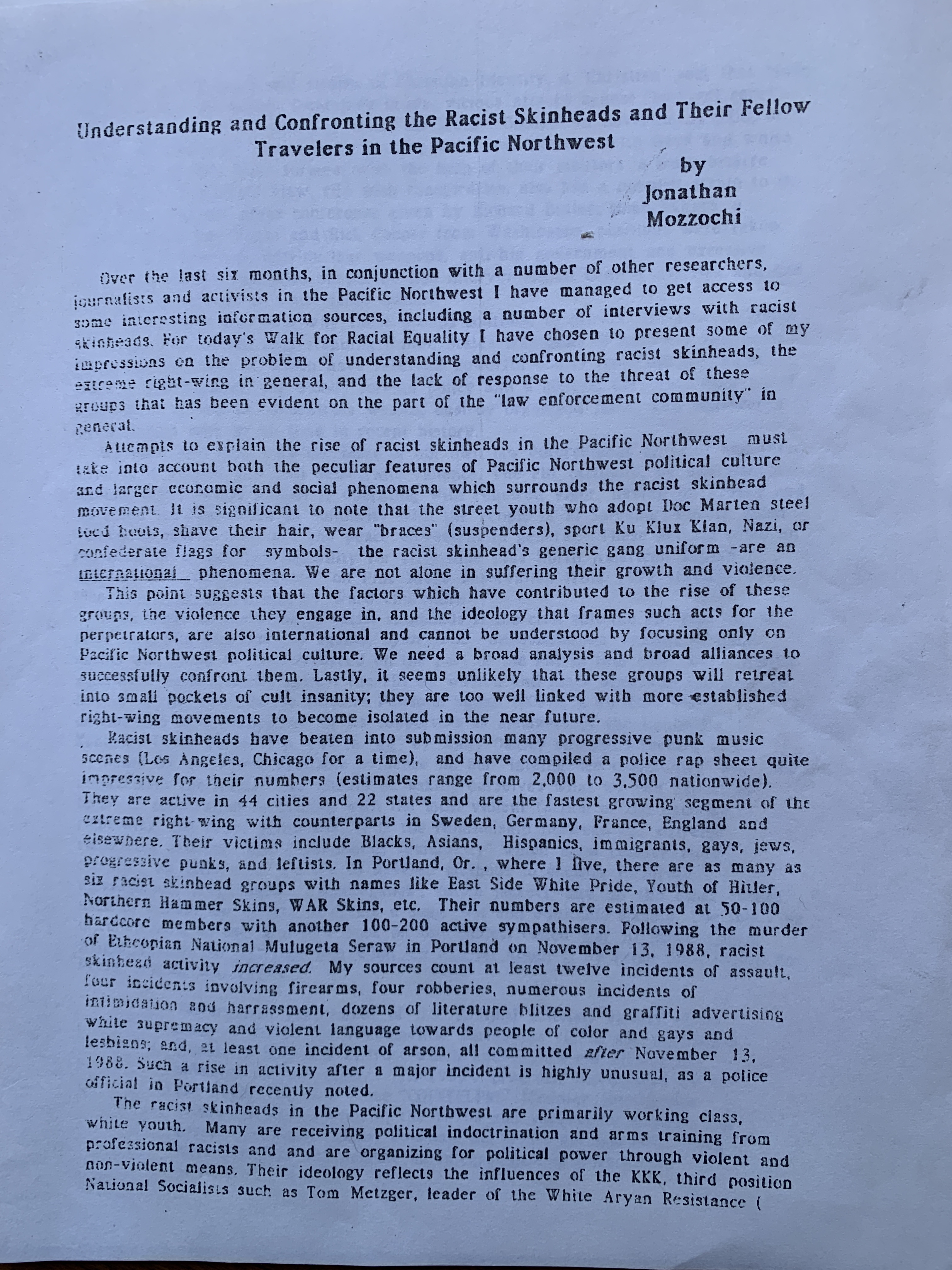 June, 1989. “The New Skinhead Assault” by Christopher Phelps published in the Portland Alliance . See also his article in Against The Current, https://againstthecurrent.org/atc032/white-supremacy-on-trial/. Pretty good socialist analysis of the far-right.