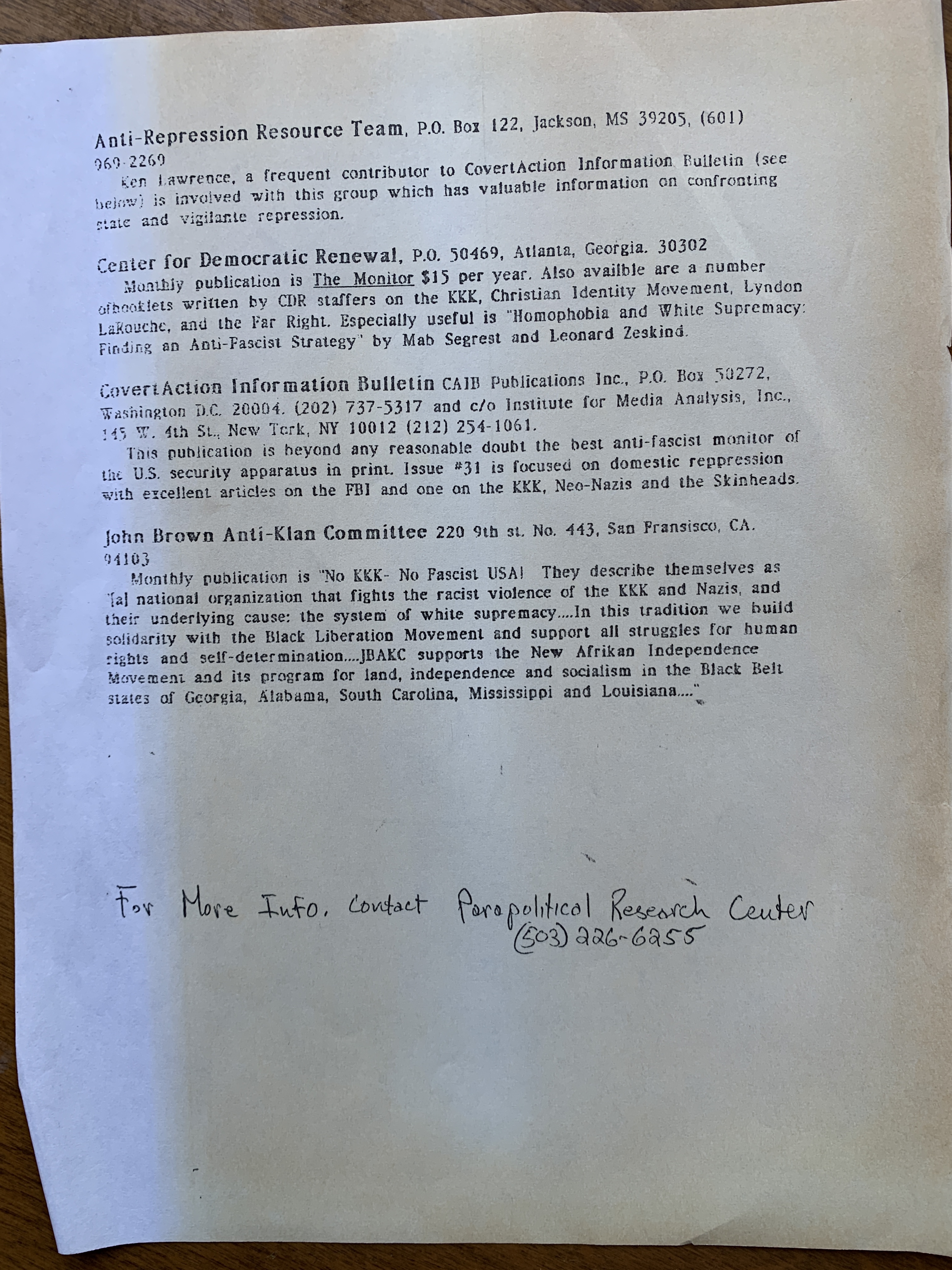 October 20, 1988–I get Portland Alliance press credentials to cover a Cult Awareness Network conference. I get in some trouble with security, but record the keynote speaker, Bill Wassmuth, who I describe as “a very good, sincere, progressive Catholic.” I am disturbed by the “cult lens” being employed to understand the far-right. It’s limited, and goofy.