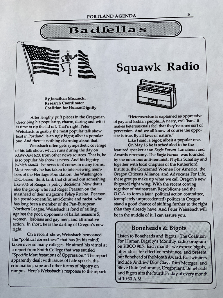 I begin writing a column in the Portland New Jewish Agenda newsletter, shepherded by Stew Albert. My column for Portland New Jewish Agenda. Our Radio show on KBOO, “Boneheads and Bigots” has been going for awhile. Bonehead of the Month winners include: Andrew Dice Clay, Tom Metzger and an Oregonian columnist.