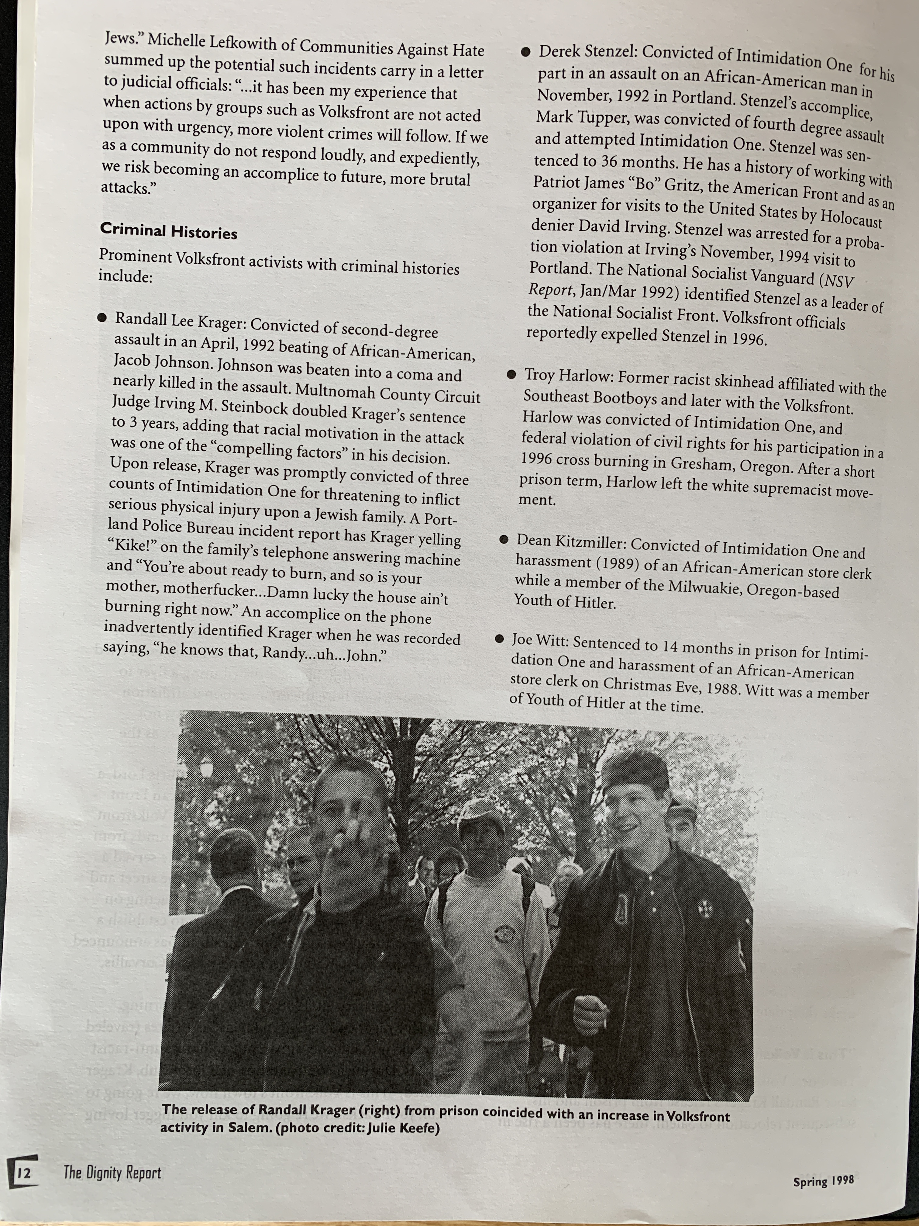 May 12, 1988–Willamette Week publishes Jim Redden’s “Young Nazis: Portland’s new breed of Racists.” This would establish Redden as an authority on the far-right in Portland, although anti-fascists constantly battled with him in print. Redden practiced a hip, transgressiveform of fascism denial and constantly attacked anti-fascists through many, many equivocation formulas. These were the days when irony was king. For a contemporary version of his garbage think Quillette written by someone in your neighborhood about shit in your neighborhood. He would later found the insipid PDXS. A 2018 Willamette Week article reprinted excerpts from Redden’s orginal article which does not appear to be accessible anywhere. https://www.wweek.com/news/2018/10/31/wws-reporting-on-how-hate-spread-across-portland-in-1988/.